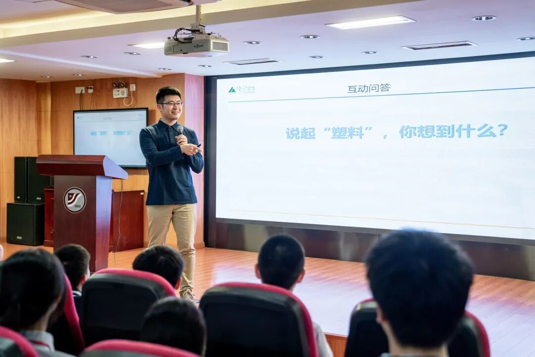 讲座上,SABIC企业志愿者从日常普遍使用的塑料开始,向同学们娓娓道来塑料的“前世今生”。以SABIC开发的 TRUCIRCLE™可持续发展的产品组合和服务为例子,介绍如何通过可循环材料和技术实现塑料的循环再利用,减少对环境的危害;针对极端天气频发的现象,与同学们分享各国政府和相关组织制定可持续发展目标的必要性。