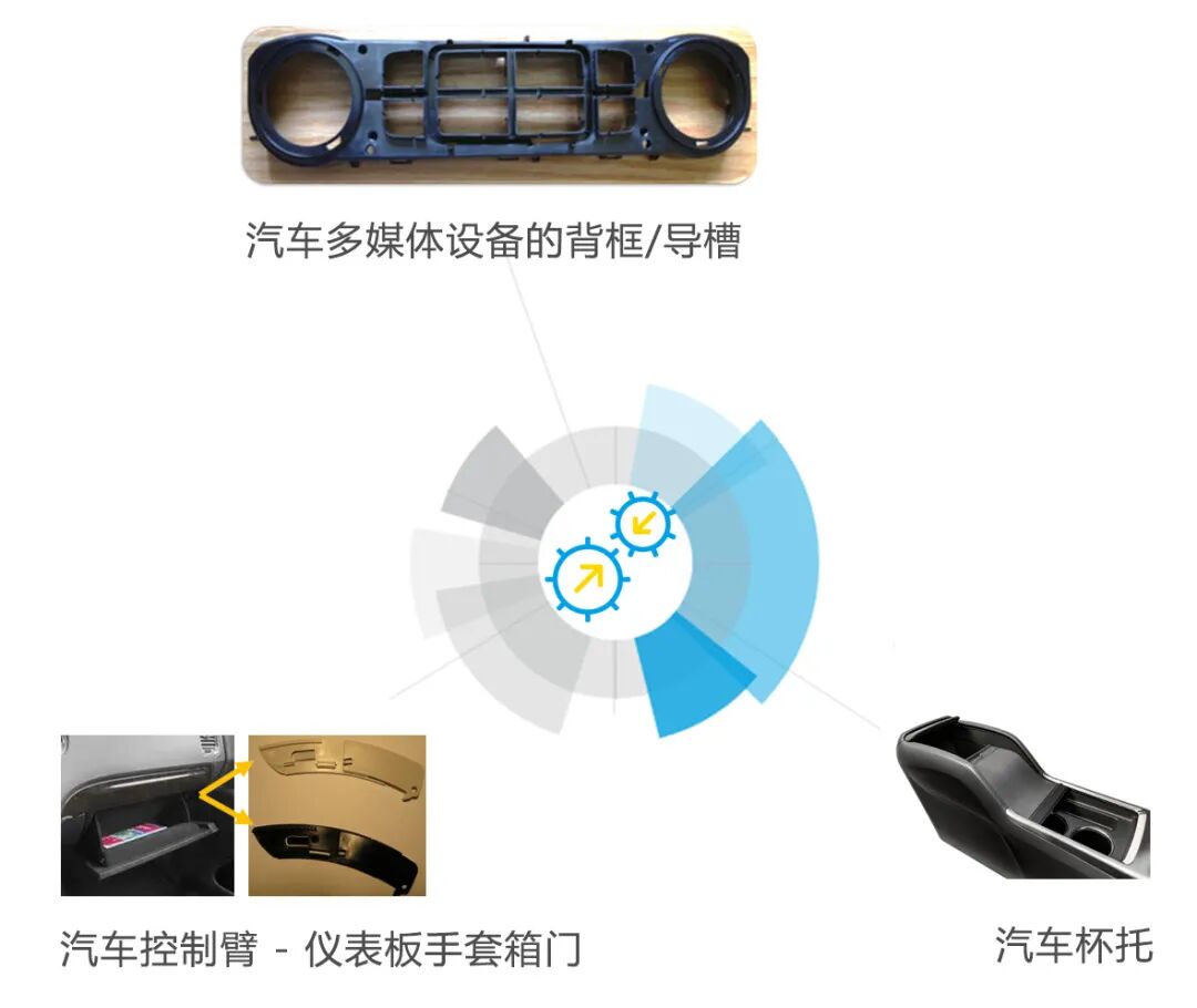 现在这种新材料不仅在后视镜外壳和装饰、杯架、按钮导轨和空调暖通系统框架等汽车内饰件上大显身手,更有望在消费电子等应用领域发挥重要作用。